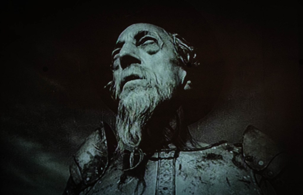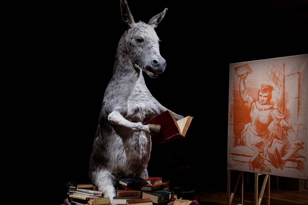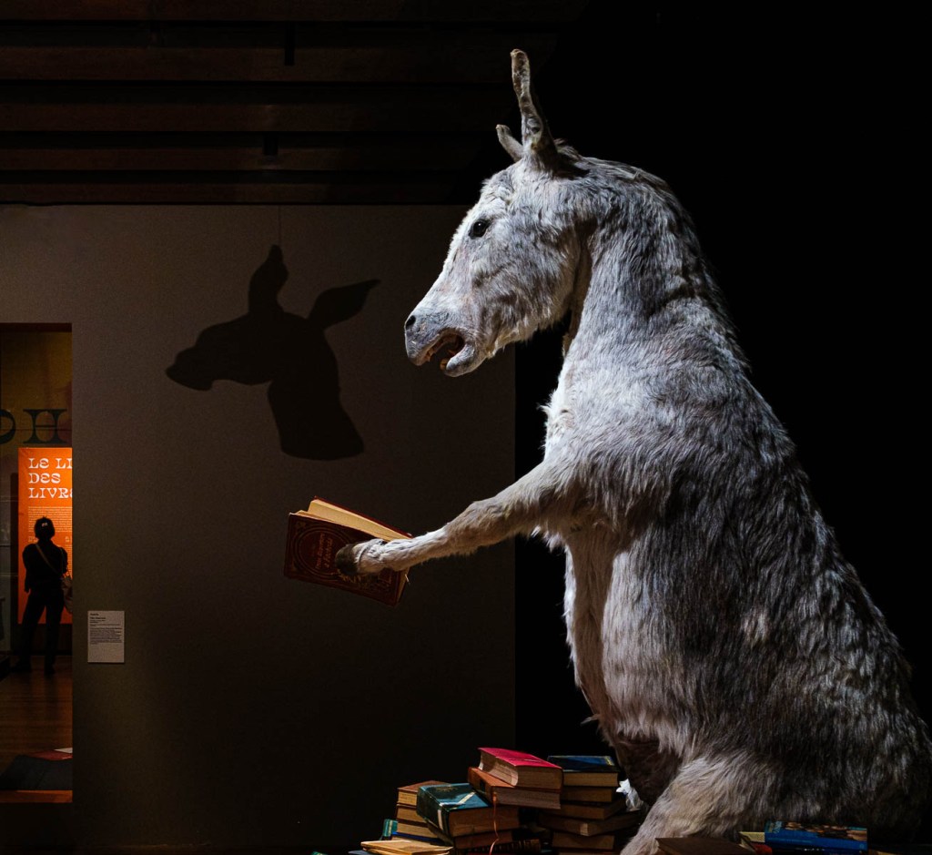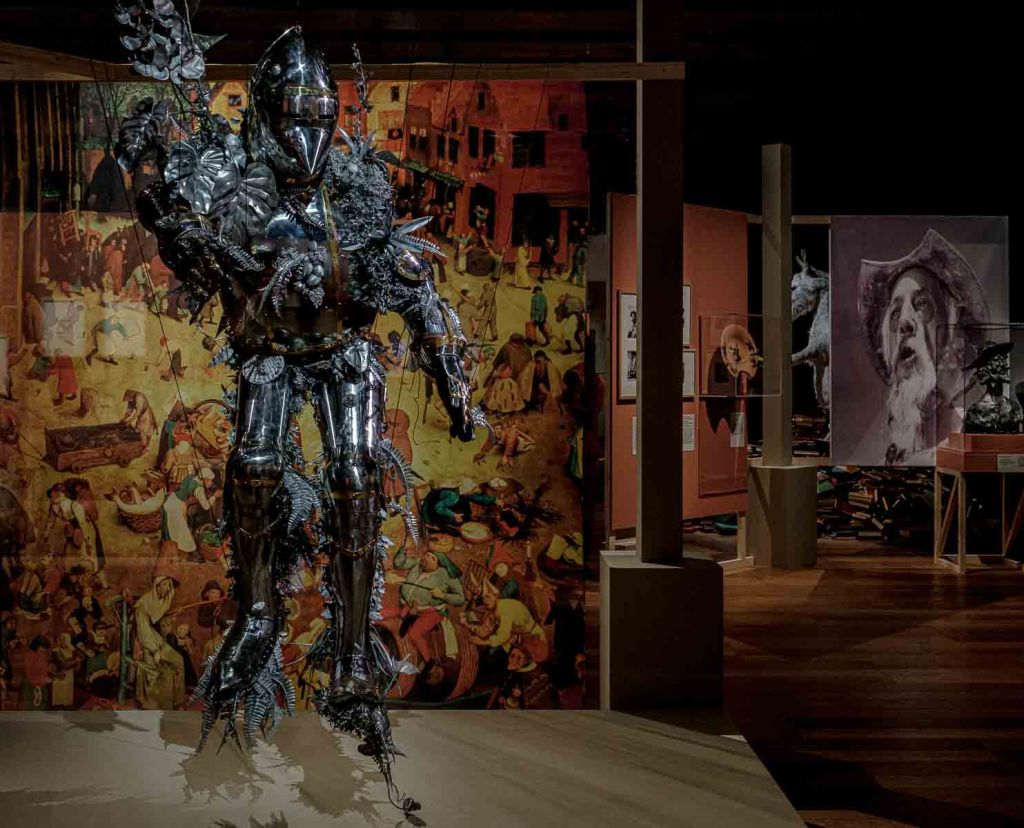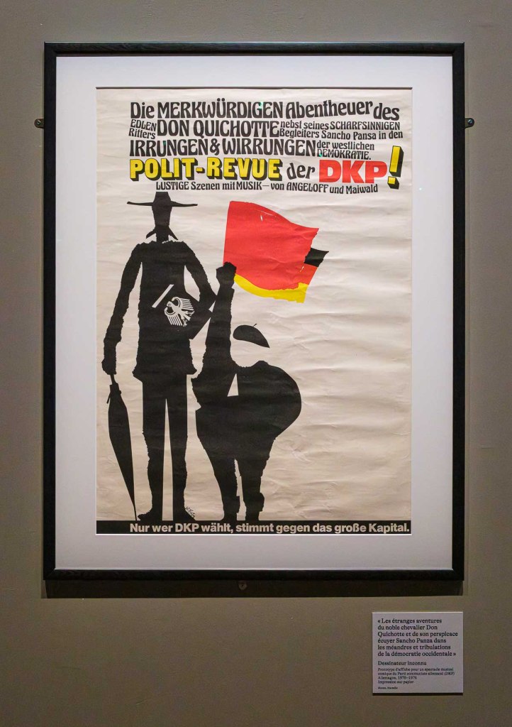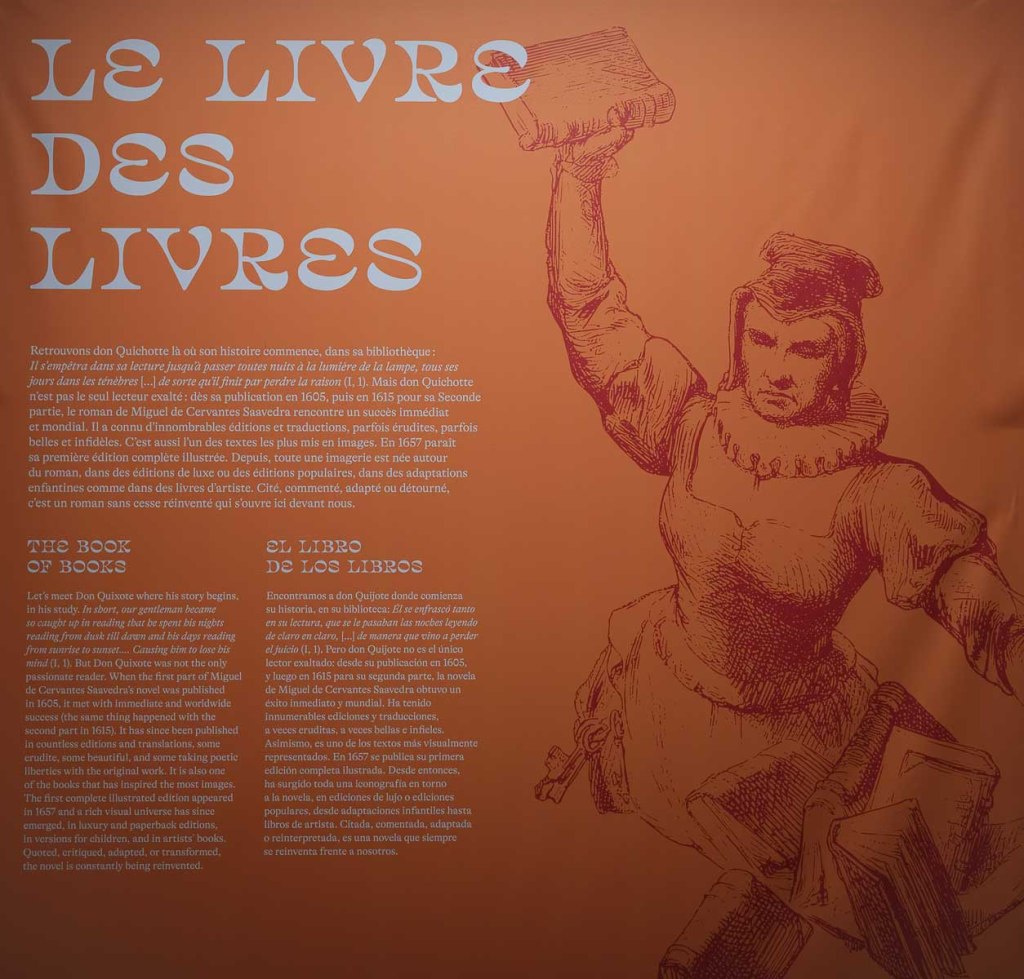 L’empan géographique et chronologique couvert par les reprises, mentions, réécritures font du personnage de Cervantès (1547-1616), une figure mythique, quasi universelle. Surprise de découvrir ces traductions nombreuses ou des usages publicitaires ou politiques, mais aussi des photographies de Michael Kenna (1996), l’écriture d’un Don Quichotte féminin – Voyage sans fin (1985) – par Monique Wittig ou les fragments d’un film inachevé d’Orson Welles.